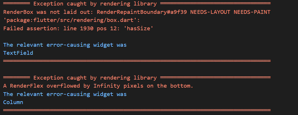 Flutter error:Failed assertion: line 1785 pos 12: 'hasSize'