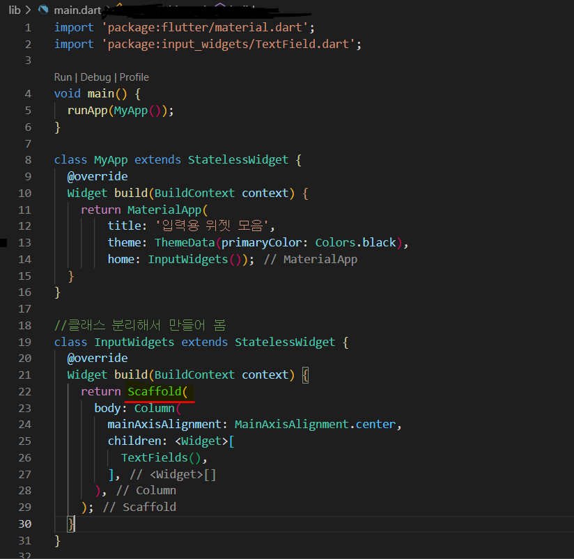 왼쪽 main.dart의 InputWidgets클래스에서 반환한 Scaffold내에, TextField.dart 파일에서 만든 TextFields()클래스를 불러와 화면에 뜨도록 하였다.
