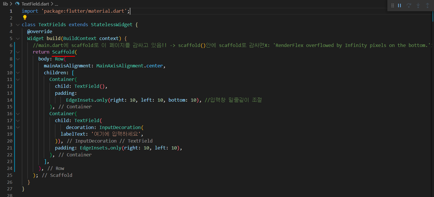 그런데, 아래에서 보면, TextFields()클래스내에서도 scaffold를 넣어 그 안에서 위젯들을 구성했기때문에 발생한 error!!!